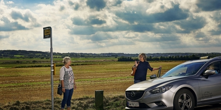 Plustur henter dig ved din adresse og kører dig til nærmeste bus eller tog, hvis du har langt til stoppestedet.