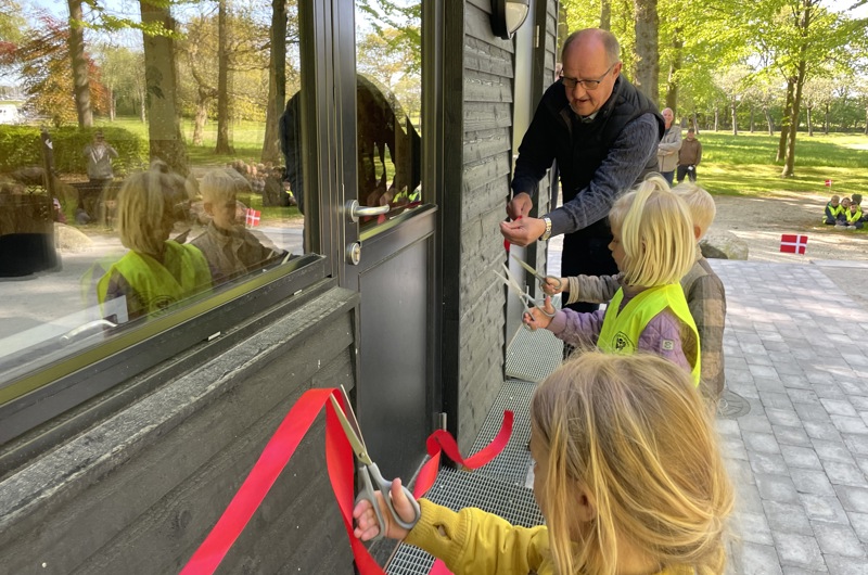 Himlen er blå, skoven er grøn, og rød-hvide flag viser, at der er noget særligt at fejre denne mandag på Soelbergsvej 4 i Nykøbing. Det er et sted, der er kendt blandt børn især for at rumme skovlegepladsen i Østre Anlæg. Nu er der endnu mere at komme efter. Det vidner en ny bygning bag legepladsen om, som denne dag har en flot rød snor langs siden. Det er madpakkehuset.